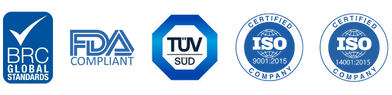 Our facility operates under internationally recognized standards to support global distribution and food-contact product safety requirements.